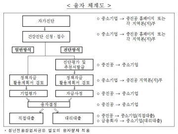 융자방식은 중진공에서 융자신청·접수해 융자대상 결정 후 중진공(직접대출) 또는 금융회사(대리대출)에서 신용 및 담보부로 대출되며, 보증서 담보는 시설자금에 대해서만 취급한다. 단. 청년전용창업자금은 중진공이 자금 신청․접수와 함께 교육․컨설팅 실시 및 사업계획서 등에 대한 평가를 통해 융자대상 결정 후 직접대출(융자상환금 조정형) 또는 취급은행(우리은행)이 자금 신청․접수와 함께 평가를 통해 융자대상 결정 후 대출된다. 융자상환금 조정형은 정직한 창업실패자에 대해 심의후 선별적으로 융자상환금의 일부를 조정되며, 청년전용창업자금 중 민간금융 매칭형은 지역신용보증재단 협약보증부로 지원돼 취급은행(1월 중 추가 예정)에서 신청·접수부터 대출까지의 모든 절차를 수행한다.