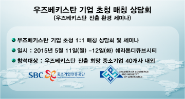 중소기업진흥공단이 우즈베키스탄 상공회의소(CCIU)와 함께 5월 11일부터 12일까지 이틀간 서울 쉐라톤디큐브시티호텔에서 개최하는 우즈베키스탄 기업 초청 매칭상담회와 진출 환경 세미나에 참여할 기업을 모집한다고 6일 밝혔다.