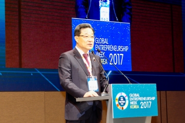 ▲ 중소벤처기업부(차관 최수규) 후원하고, (재)한국청년기업가정신재단(이사장 남민우), 세계기업가정신네트워크(GEN, 회장 조나단 오트만), 등 공동으로 주관하는 2017 세계 기업가정신주간 개막식이 서울 드래곤시티에서열렸다. 최수규 중소벤처기업부 차관은 2017 세계기업가정신주간 개막식에서 환영사를 하고 있다.중소벤처기업부(차관 최수규)가 후원하고, (재)한국청년기업가정신재단(이사장 남민우), 세계기업가정신네트워크(GEN, 회장 조나단 오트만), 대한상공회의소(회장 박용만), 산업정책연구원(이사장 김태현)이 공동으로 주관하는 2017 세계기업가정신주간 한국행사(GEW Korea 2017)가 13일부터 14일까지 서울 드래곤시티(아코르 앰버서더 용산호텔(용산구) 5층 그랜드볼룸)에서 성황리에 개막됐다.