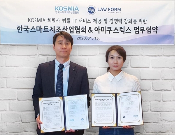 (사)한국스마트제조산업협회(회장 김태환)와 아미쿠스렉스 주식회사(대표 정진숙 변호사)는 15일 ‘회원사 경쟁력 강화를 위한 법률 IT서비스 제공’ 에 관한 업무협약을 체결했다고 밝혔다.