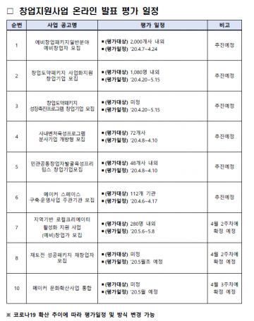 중소벤처기업부(장관 박영선, 이하 중기부)는 코로나 19 확산 방지를 위해 7일부터 ‘예비창업패키지’ 대면평가를 시작으로 모든 창업지원사업의 대면평가에 비대면 온라인 평가를 적용한다고 밝혔다.
