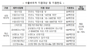 특히 혁신성장기업들의 전략지원을 위해 브랜드케이(K) 등 혁신바우처에 선정된 기업(스타트업바우처 제외, 스타트업바우처는 수출규모 관계없이 3천만원 지원(보조율 70%))은 성장바우처와 달리 전년도 수출규모와 관계없이 기업의 수요에 따라 최대 1억원까지 지원한다.