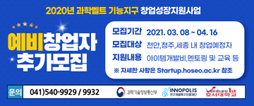 한편, ‘2020년 과학벨트기능지구 창업성장지원사업’ 추가모집에 대한 자세한 사항은 호서대학교 창업지원단 홈페이지(http://startup.hoseo.ac.kr) 공지사항에서 확인할 수 있다.