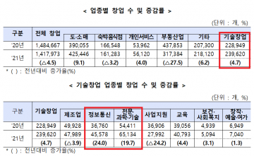 특히, 온라인․비대면화로 인해 정보통신업(24.0%↑), 전문과학기술업(19.7%↑) 등에서 창업이 크게 증가하면서 기술기반업종창업(이하 ‘기술창업’)은 역대 최초로 23만개를 돌파했다.