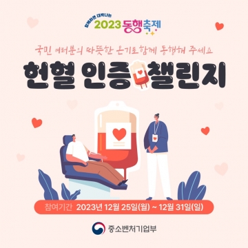 중소벤처기업부(장관 이영)는 25일부터 1주일 간 2023 눈꽃 동행축제 ‘온기 나눔 운동(캠페인)’의 일환으로, 헌혈 인증을 통해 자신의 온기를 주변에 전파하는 ‘헌혈 인증 챌린지’를 시작한다고 밝혔다.