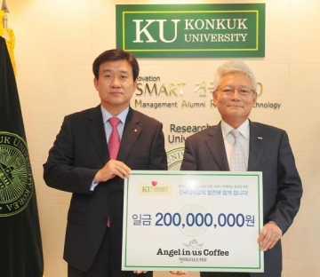 커피 전문점 엔제리너스커피가 건국대 인근 상가의 발전기금 기부 운동인 ‘스마트(SMART) 건국대(KU) 패밀리’ 기부 캠페인에 2억원의 발전기금을 기부했다.